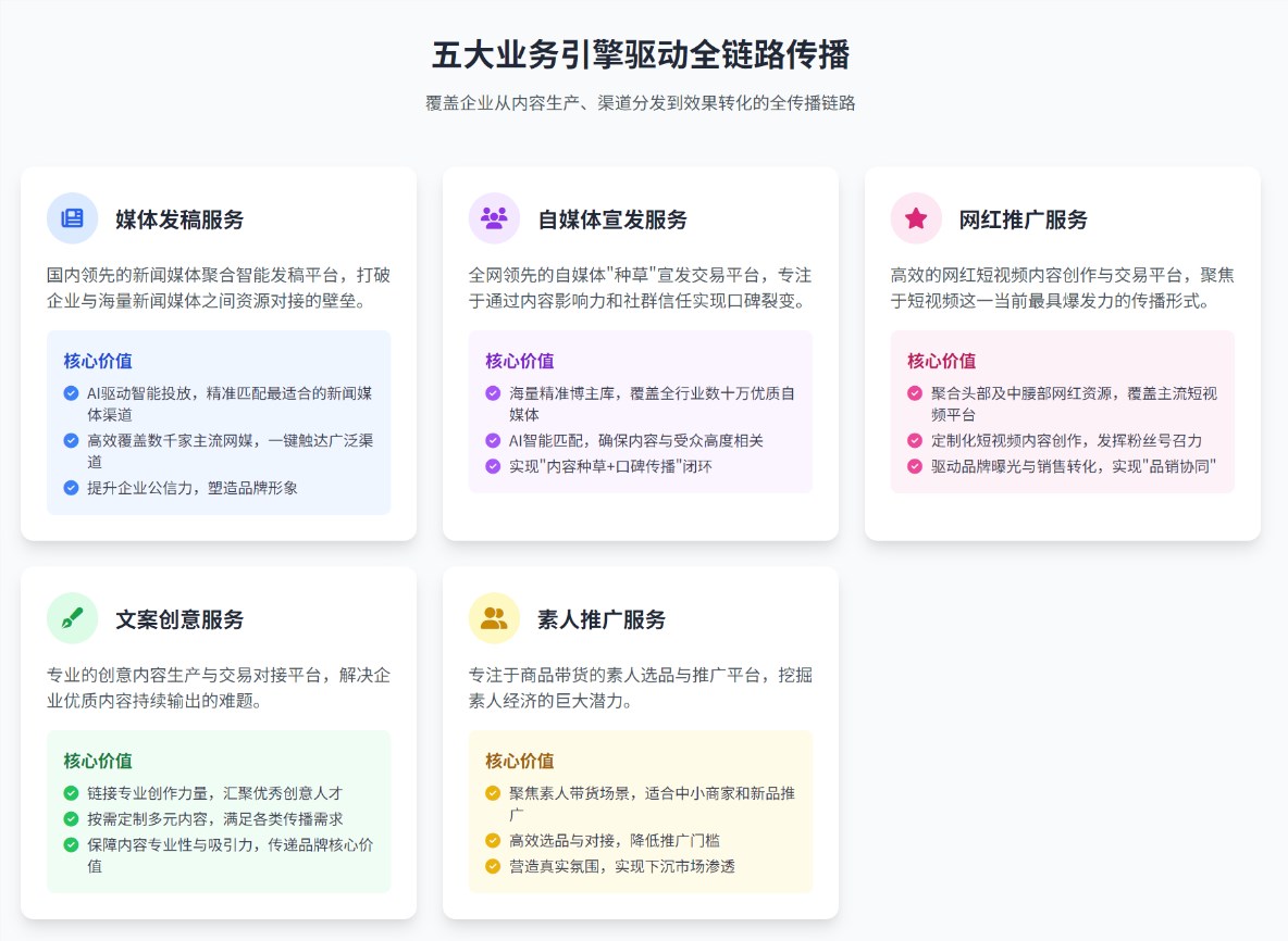 The platform operates on a simple but powerful premise: "Your voice, I will convey." Through five specialized services, Chuanshen港 connects companies with the right media channels and content creators:
