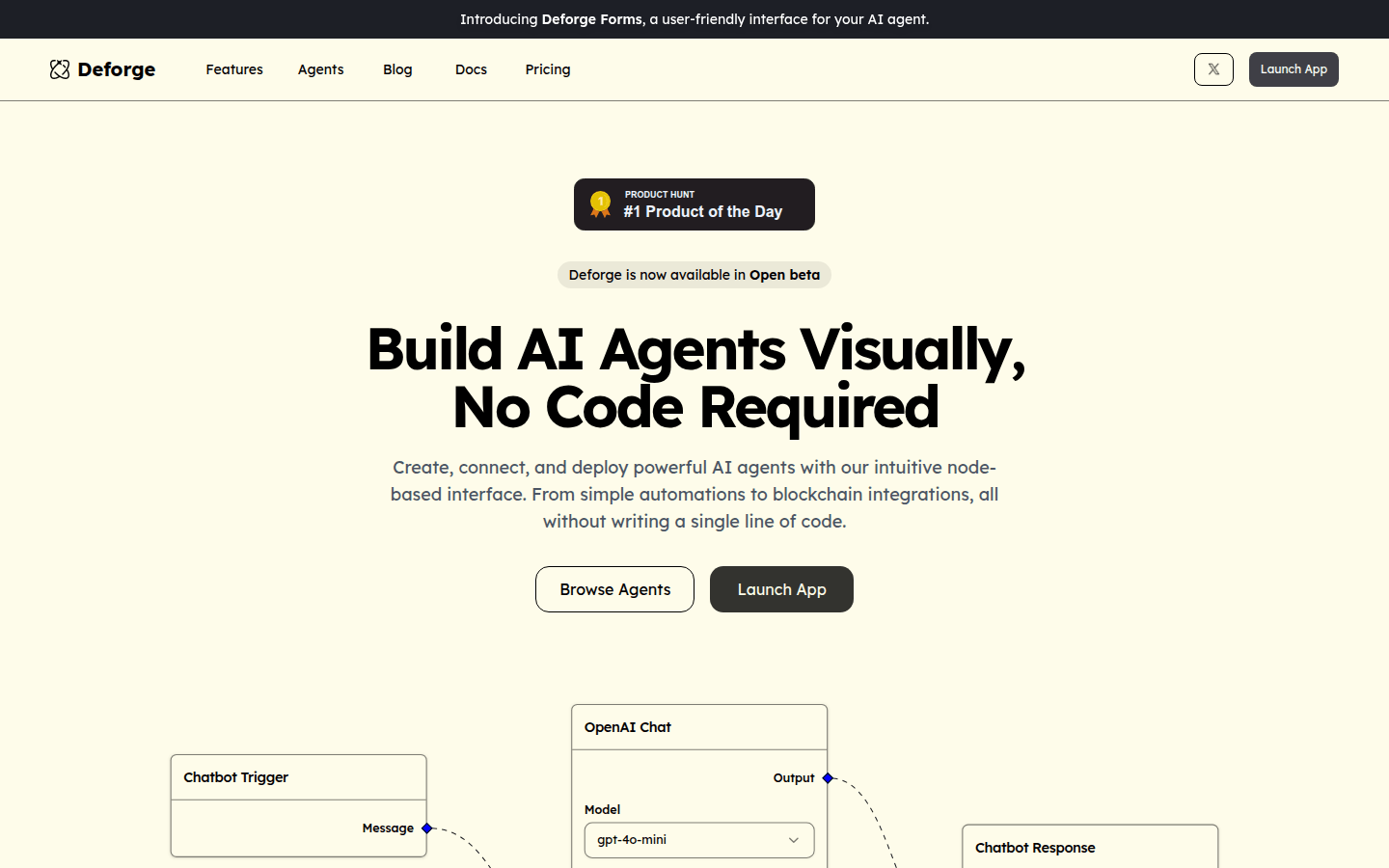 Deforge is a cutting-edge tool designed to democratize the creation of AI agents by eliminating the need for coding. It provides a node-based interface that allows users to visually construct and connect AI agents for various applications, from simple automation tasks to complex blockchain integrations. This tool is particularly beneficial for those who lack programming skills but wish to harness the power of AI.
