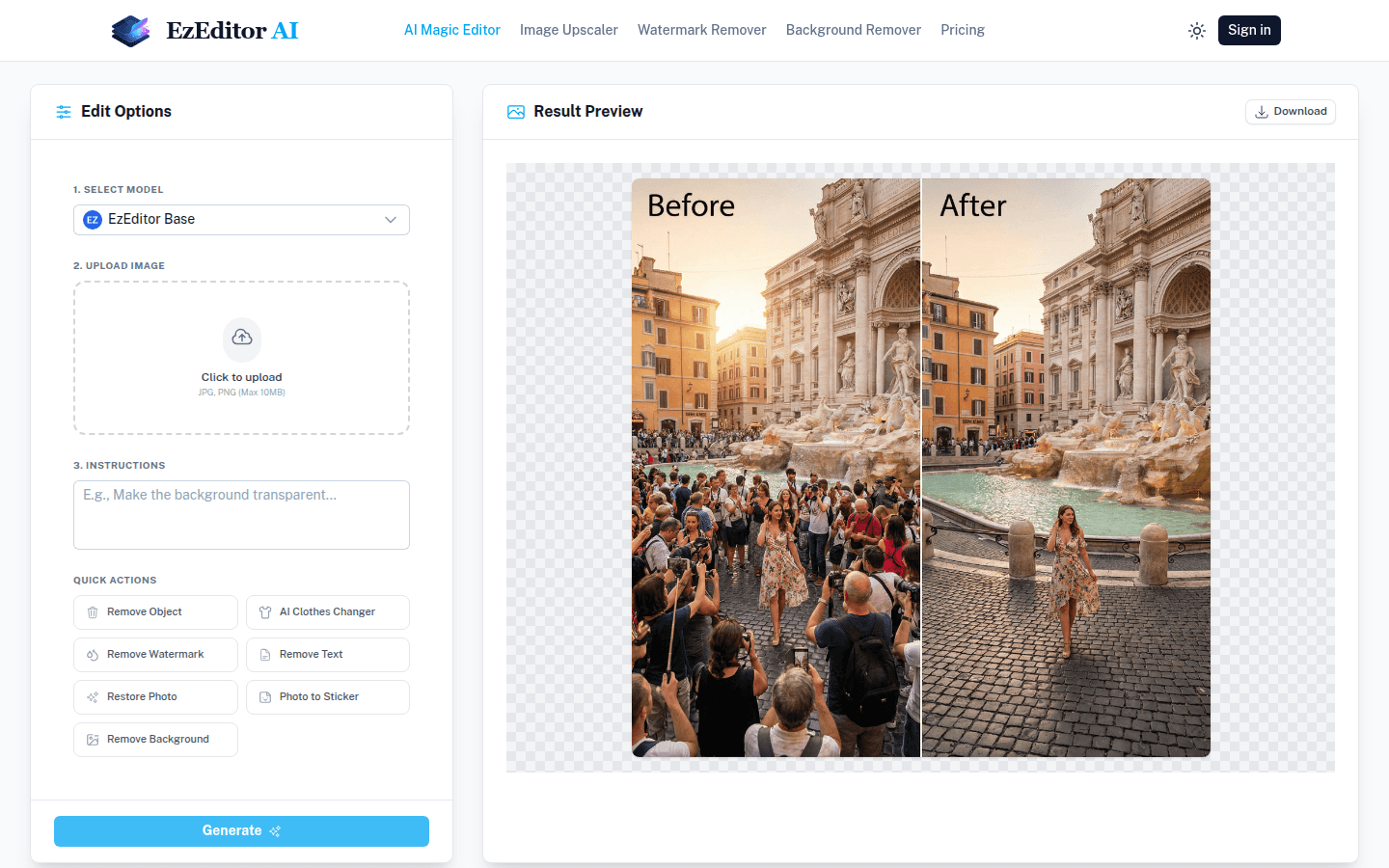 Ever wished you could magically edit photos just by describing what you want? Meet EzEditor AI—your new creative sidekick that turns text prompts into stunning visual transformations.