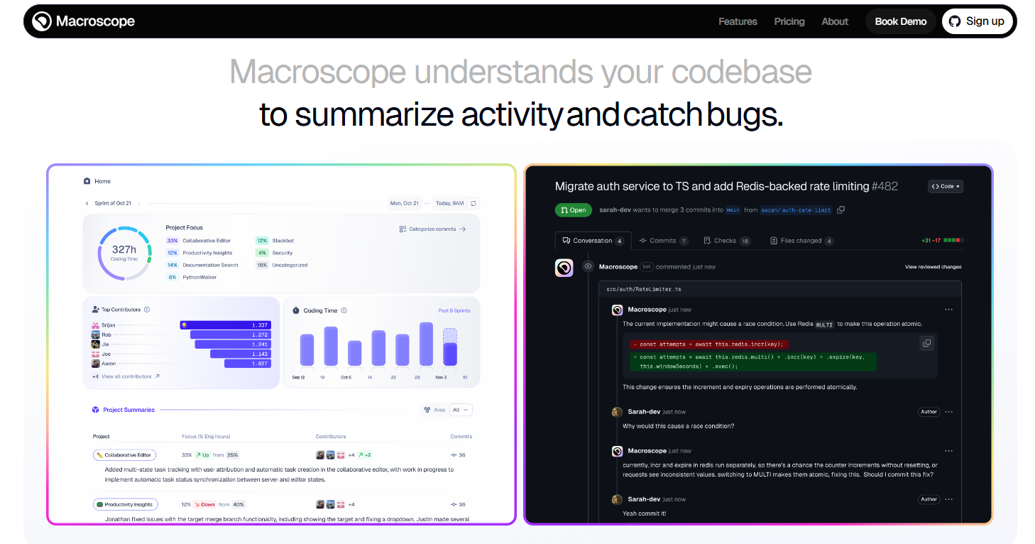 Macroscope is a cutting-edge programming efficiency tool tailored for R&D teams, backed by $30 million in Series A funding. It addresses common pain points such as heavy non-development workloads for engineers and lack of visibility into R&D progress for managers. By leveraging AI models like OpenAI o4-mini-high and Anthropic Opus 4, Macroscope ensures high accuracy in code reviews while maintaining data security with SOC 2 Type II compliance.