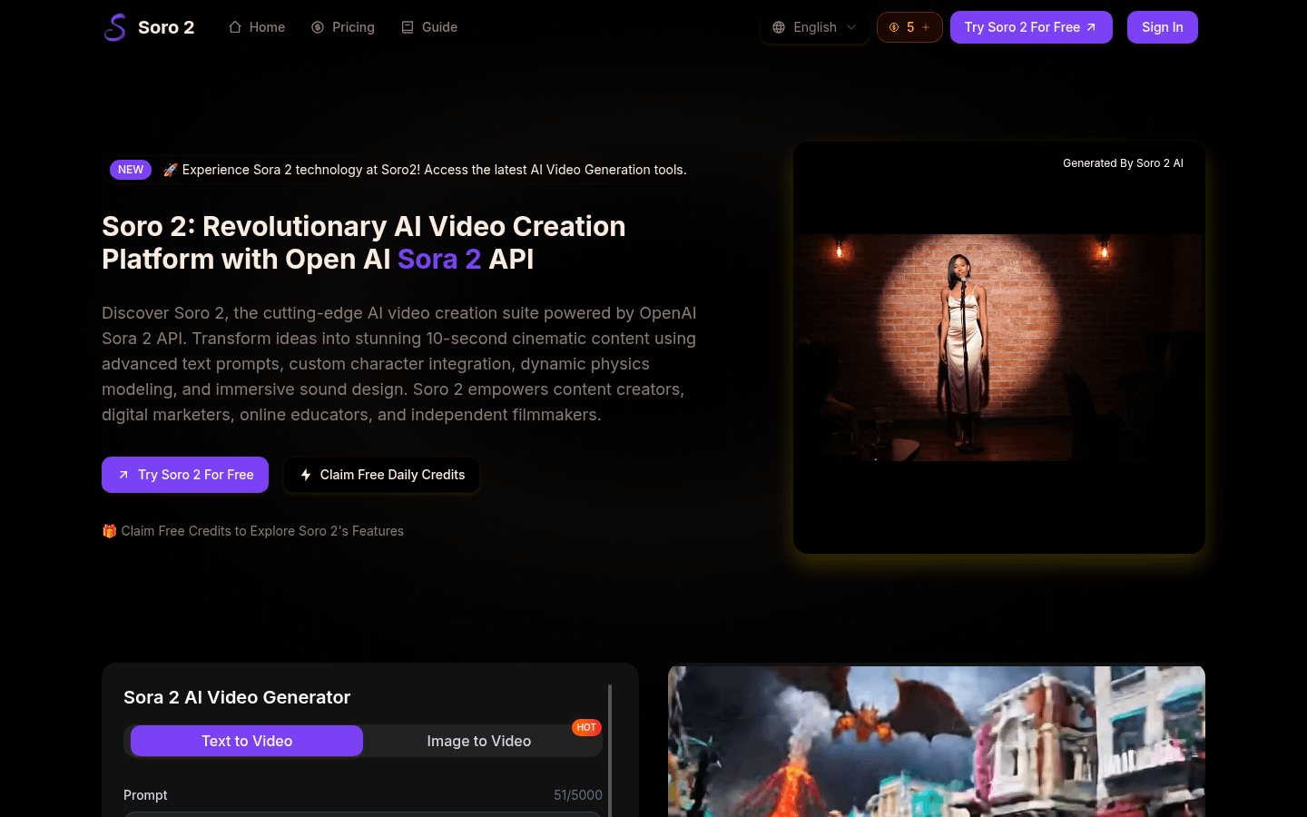 Soro2 is a cutting-edge AI video creation platform powered by OpenAI Sora 2 API. It revolutionizes digital video production by enabling users to convert complex text instructions and reference images into high-quality videos. The platform targets content creators, digital marketers, online educators, and independent filmmakers who need professional-grade video content without extensive production resources.