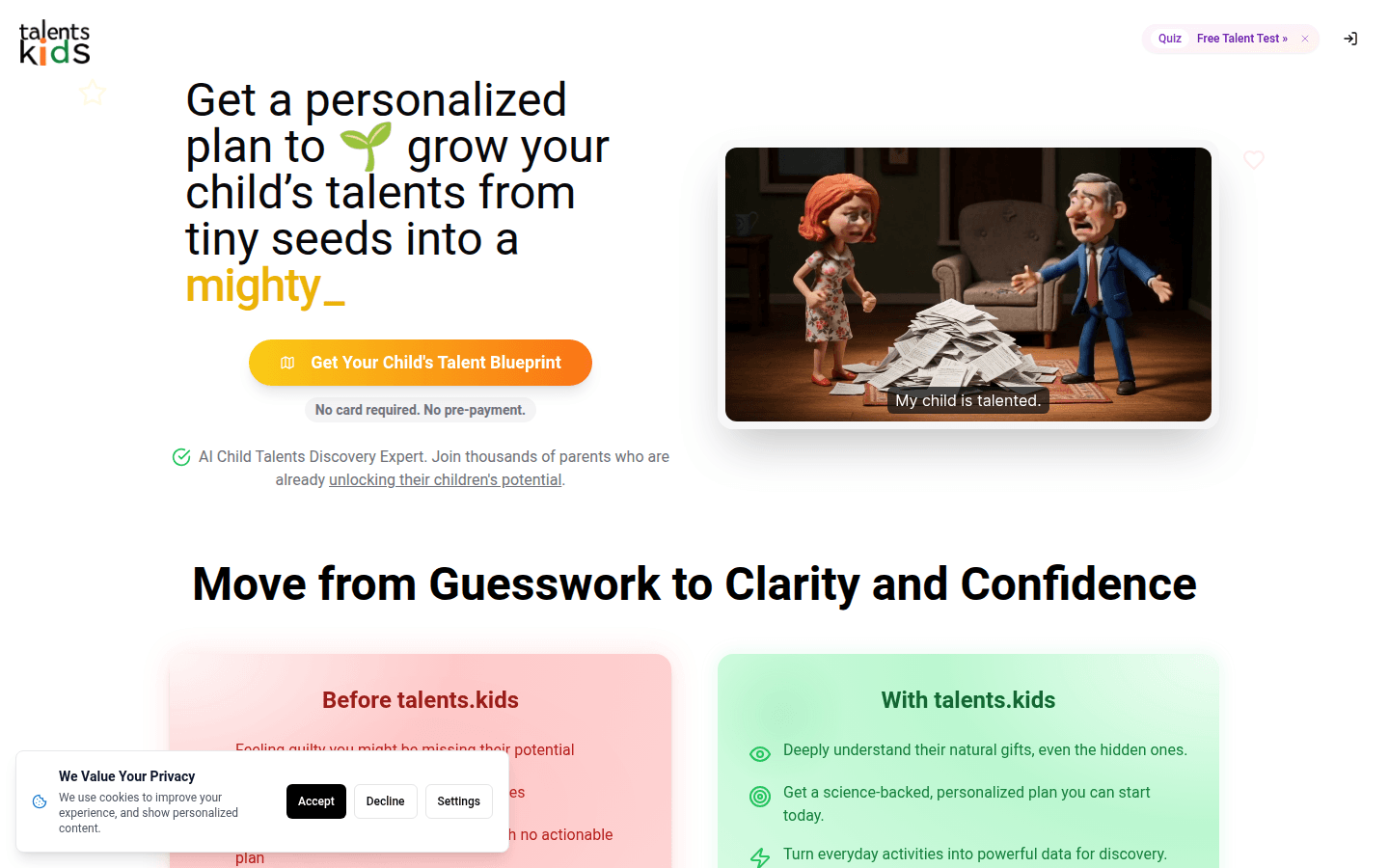 Talents.Kids is an innovative AI-powered platform dedicated to uncovering and fostering children's innate talents. By leveraging advanced algorithms, it provides parents with actionable insights into their child's strengths and potential. The platform is designed for parents who seek to understand and develop their child's abilities in a structured and scientific manner.