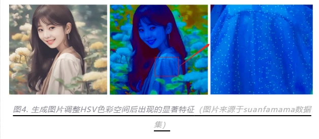 The AI-generated image detection system distinguishes between real and AI-generated images by analyzing various characteristics. AI-generated images often exhibit unrealistic features, such as a flying puppy with wings or a cat smoking a cigar, which can be attributed to a lack of common sense logic. Additionally, these images may require "watermarking," which involves including explicit or implicit markers that can be either visible or invisible to the naked eye. The detection tool is designed to identify these markers and other hidden features, such as bright spots with densely distributed local textures when adjusting the HSV color space.