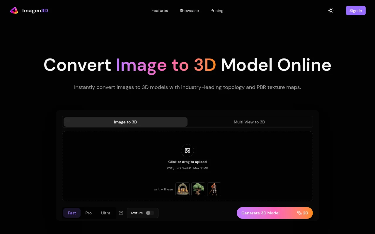 Ever wished your sketches could leap off the page? Imagen3D makes it happen by converting flat images into fully-realized 3D models using cutting-edge AI. No specialized skills required - just upload, click, and watch your creations come to life.