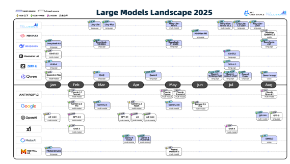 随附的时间轴地图记录了自2025年1月以来主要模型的发布情况,包括: