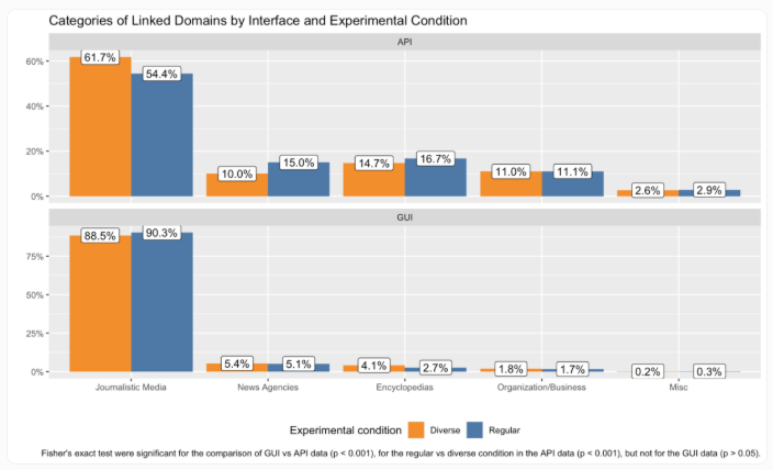 - 45.5% vs. 27.3%覆盖可靠新闻机构(网页 vs. API)