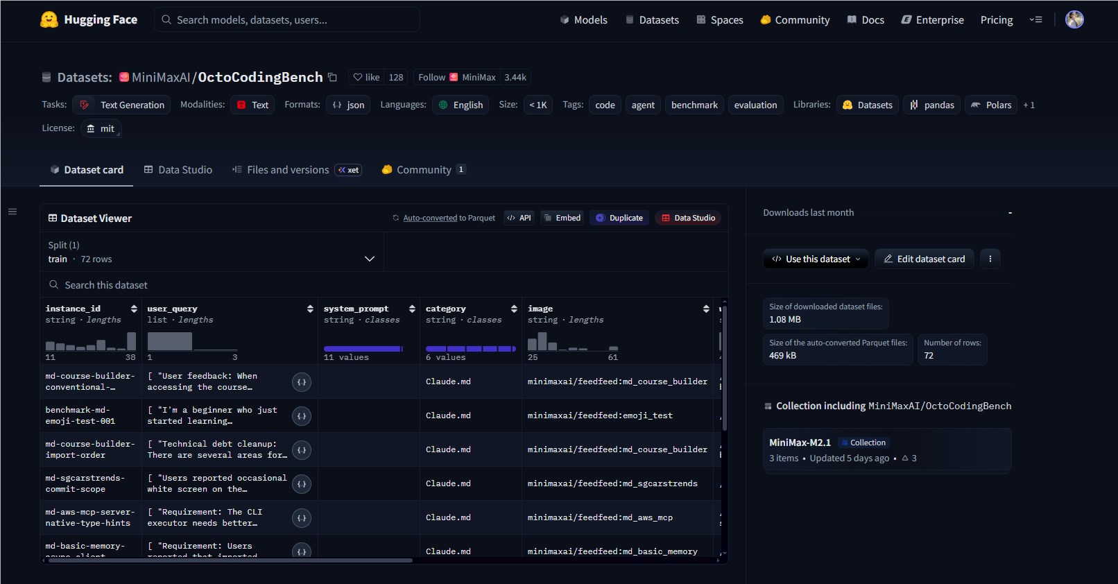 The随着企业日益依赖AI结对程序员同时要求企业级可靠性,时机再好不过了."".replace(/"/g,'"')"".replace(/"/g,'"')"".replace(/"/g,'"')"".replace(/"/g,'"')"".replace(/"/g,'"')"".replace(/"/g,'"')"".replace(/"/g,'"')"".replace(/"/g,'"')"".replace(/"/g,'"')"".replace(/"/g,'"')"".replace(/"/g,'"')"".replace(/"/g,'"')"".replace(/"/g,'"')"".replace(/"/g,'"')"".replace(/"/g,'"')"###关键要点:"-新标准:OctoCodingBench评估规则遵循而不仅是功能性-实战就绪:在72个场景中测试七个指令源-开发者友好:开源且支持Docker便于采用-现已可用:数据集已发布于HuggingFaceMiniMaxAI/OctoCodingBench