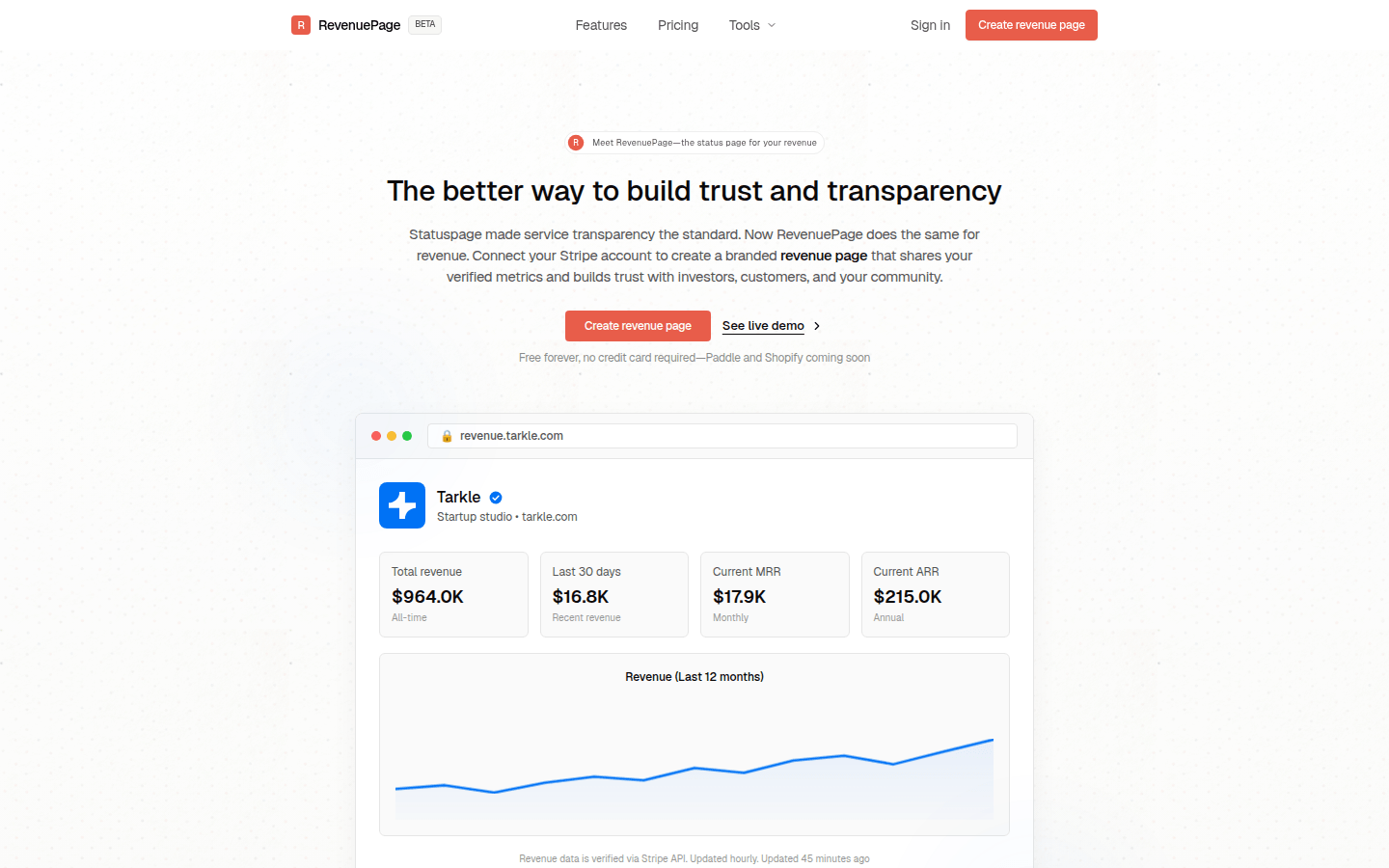 是否曾为向投资者证明初创企业的吸引力而苦恼?RevenuePage通过将您的Stripe数据转化为美观且始终更新的收入仪表板来解决这一问题。