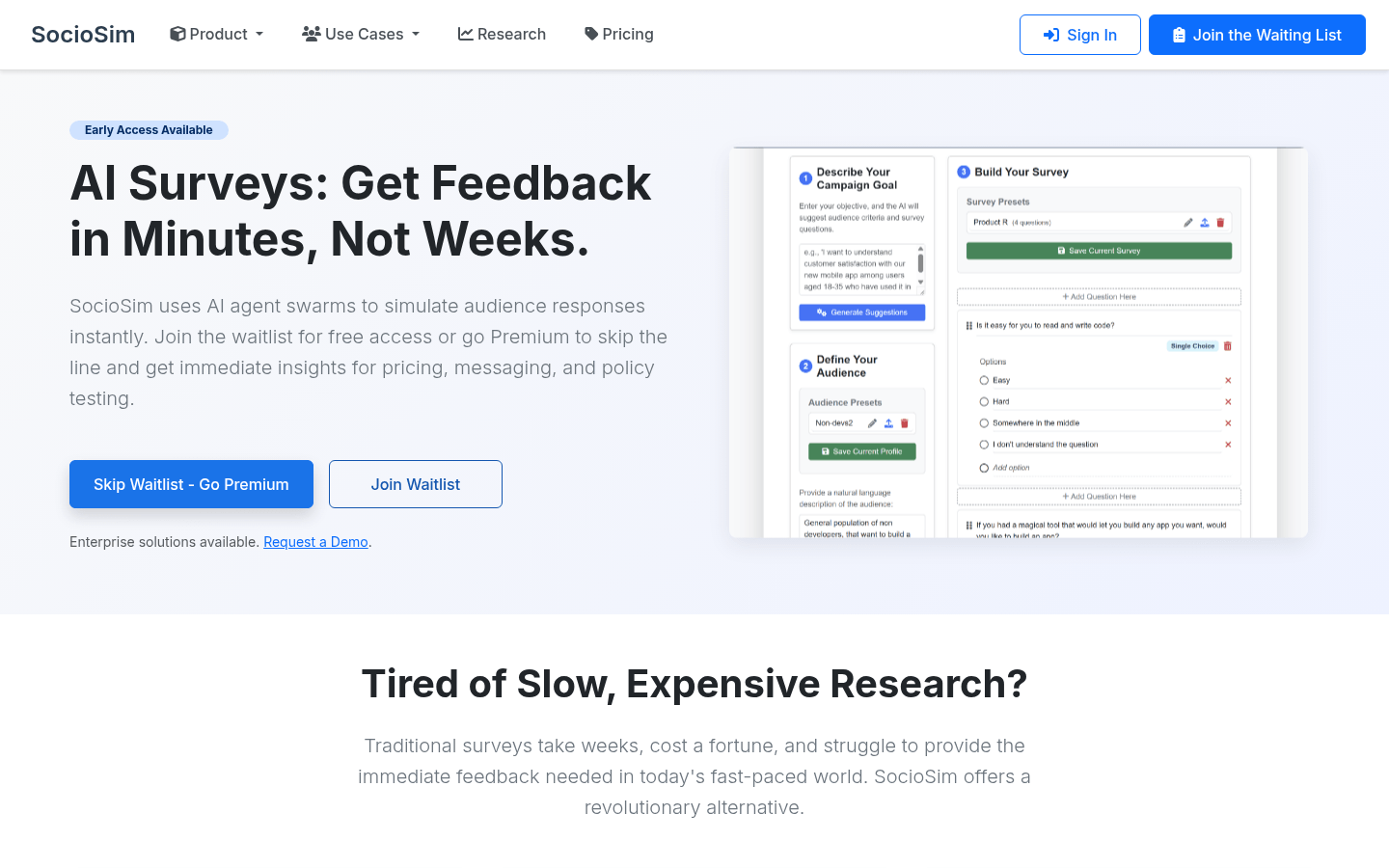 SocioSim通过AI驱动的受众模拟彻底改变了市场调研。该工具可在几分钟而非几周内生成关于定价策略、广告活动和政策决策的真实反馈。企业可在推出前测试想法,无需昂贵的焦点小组。