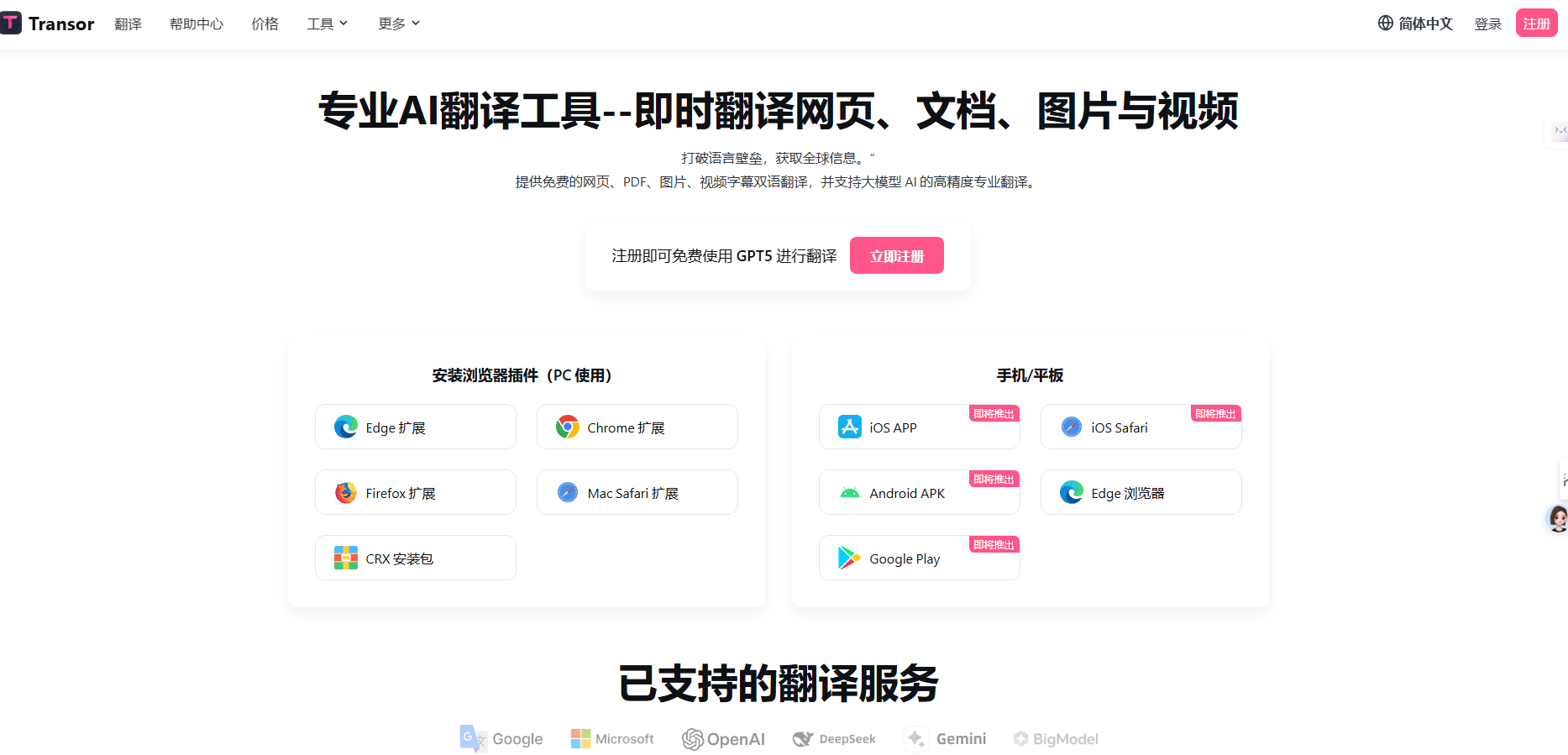 Transor是一款前沿的AI翻译工具,旨在通过为网页、文档和视频字幕等多种内容类型提供实时翻译来消除语言障碍。利用先进的AI技术,Transor确保翻译的高准确性和高效率。它可在多个平台上使用,包括网页版、浏览器插件(如Chrome)和移动应用程序(iOS)。用户可以免费注册以访问其全套功能。