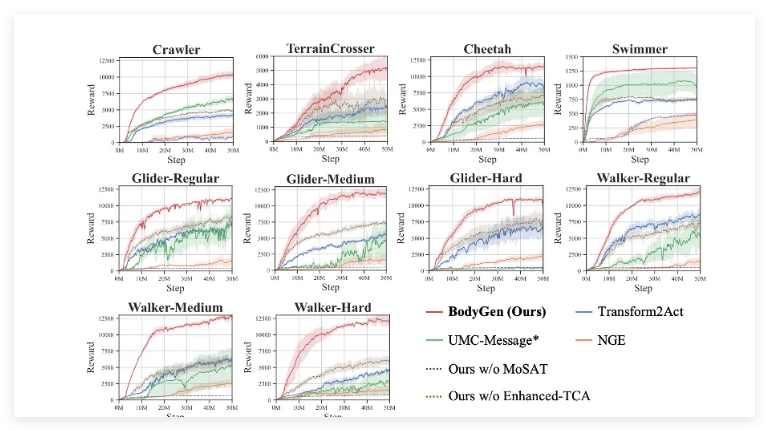 在涵盖爬行和游泳等10项多样化任务的测试中,由BodyGen生成的机器人相比现有最先进方法实现了60.03%的适应性评分提升。此外,BodyGen的参数数量仅为1.43M,显著轻量化,非常适合资源受限的环境。