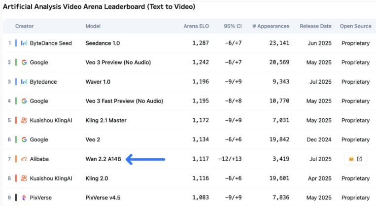 该模型在开源选项中排名第一,并在文本到视频生成中总体排名第七,展现了将文本描述转化为高质量视频内容的卓越能力。然而,在图像到视频转换方面,Wan2.2A14B排名第14位,因其最大输出仅为每秒16帧——明显低于某些竞争对手的24帧能力。