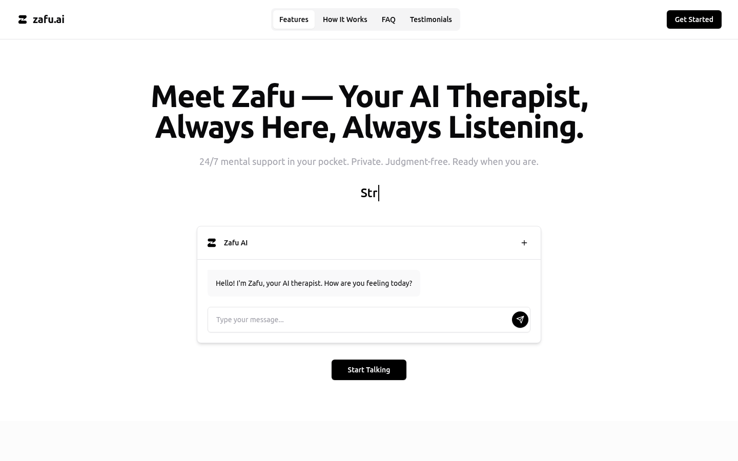 Zafu.ai利用AI技术随时随地提供可及的心理健康支持。这一创新工具为用户创造一个安全空间,通过个性化对话应对焦虑、压力和情绪挑战。与传统治疗不同,它无需预约或等待,全天候可用。